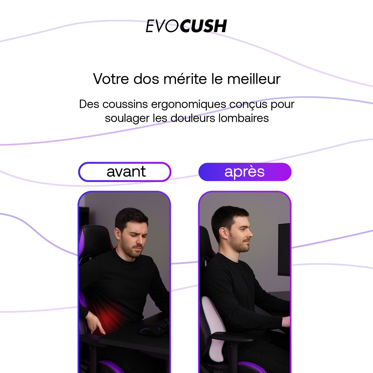 Avant, c'était l'inconfort, les douleurs lombaires et une posture qui fatigue au fil des games. Avec EvoCush, transformez n’importe quelle siège en une chaise de gaming ergonomique offrant un maintien optimal, une assise ventilée et un confort longue durée pour jouer ou travailler sans douleur.